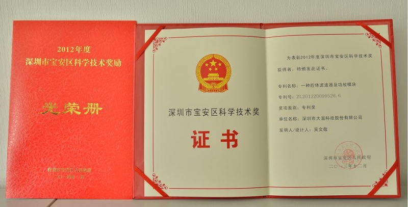 2014年1月15日上午,宝安区召开科技工作者座谈会,对2012年度为宝安区科技创新和经济社会发展做出突出贡献的36个科技人员及单位进行表彰奖励。深圳市球友会(中国)股份有限公司(以下简称“我司”)凭借“一种腔体滤波器及功放模块”荣获宝安区科学技术奖之专利奖。