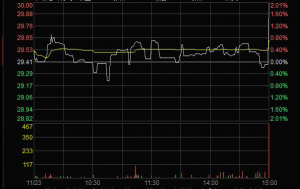 2011年11月23日临近收盘期间(14:56:24至14:59:28),任某某为了在短期内拉升股价,大量申报买入“X”4笔共计63,000股,占尾市阶段市场申买量的比例高达75.54%;委托价格由29.60元升至32.00元,每笔均高于当时市场上的买1档价格,三分钟内将股价由29.35元拉升至30元收盘,拉升幅度达2.21%。(见下图)